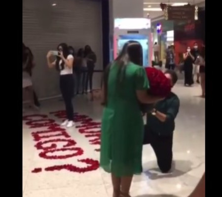 Um rapaz escreveu 'namora comigo?' com pétalas de rosas vermelhas no chão do andar L3 próximo à escada rolante e surpreendeu sua amada com um pedido.