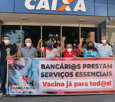 Bancários realizaram nesta quinta-feira (27) o Dia Nacional de Luta pela inclusão da categoria como essencial no Plano Nacional de Imunização (PNI) e por vacina para todos. Em Teresina, a manifestação aconteceu na agência da Caixa Econômica Federal, em frente a praça Rio Branco, e agência do Banco do Brasil Central, da Rua Álvaro Mendes.