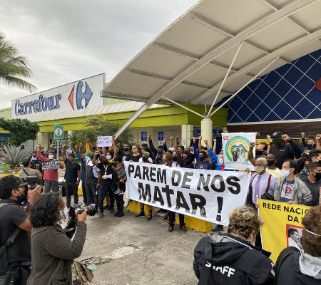 Um grupo fez um protesto em frente a uma unidade do supermercado Carrefour na Barra da Tijuca, na Zona Oeste do Rio, na tarde desta sexta-feira (20).