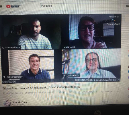 Com o tema “Educação em tempos de isolamento: Como lidar com este fato?”, participaram do Live organizada por Marcelo Parra, da Faculdade de Educação da USP (FEUSP); a professora Dra. Carlota Boto (USP); a professora Dra. Maria Luisa Furlan Costa, da Universidade Estadual de Maringá (UEM), e o secretário de Estado da Educação, Felipe Costa Camarão.