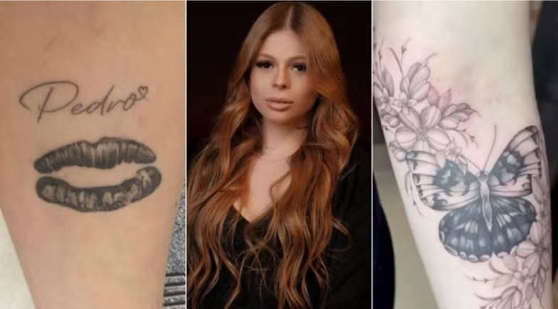 Durante o relacionamento, Samira tatuou o nome de Pedro no braço, além de um beijo dele e a letra “P” no ombro. As marcas, que se tornaram dolorosas lembranças após a violência, foram substituídas por uma borboleta cercada por flores.
