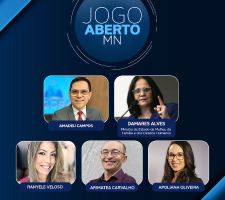Na edição desta sábado (25/07), o programa Jogo Aberto MN, apresentado pelo comentarista político, Amadeu Campos, contará com a participação dos jornalistas Arimatea Carvalho, Ranyelle Veloso e Apoliana Oliveira e terá como convidada especial a Ministra dos Direitos Humanos, Damares Alves.