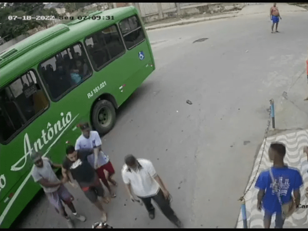 Pessoas se aproximam para ajudá-lo, inclusive o motorista do ônibus. Depois de um tempo, ajudado por populares, ele se levanta e sai andando.