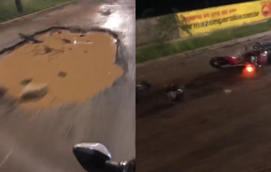 Imagens divulgadas nas redes sociais mostram o momento do acidente. Nas imagens, um outro condutor filma o buraco na avenida quando é surpreendido com o motociclista caindo no local.