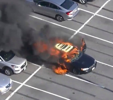 O momento foi registrado por um helicópitero de uma emissora de TV que passava pelo local no exato momento. As imagens compartilhadas pelo NYPost, mostram os bombeiros correndo para apagar o fogo que se alastrou por todo o carro.
