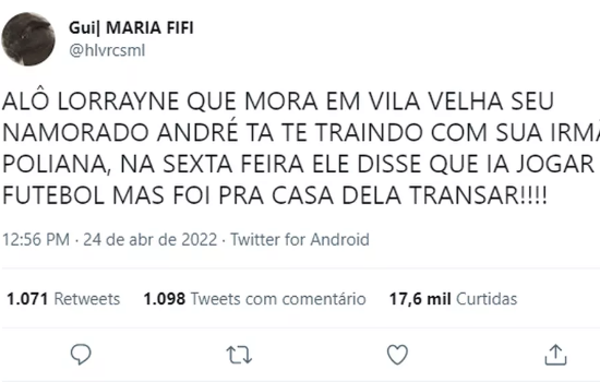 O capixaba Guilherme Lemos, de 19 anos, viralizou no Twitter após relatar uma conversa que ouviu na qual um homem admitia enganar a namorada para se encontrar com outra mulher. A publicação gerou tanta repercussão que chegou até mesmo aos envolvidos, agora ex-namorados.