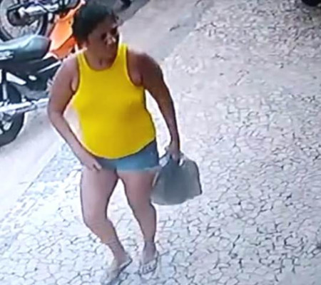 As câmeras de segurança de monitoramento interno mostram a mulher vestida em uma blusa amarela usando um short jeans, adentrando o recinto privado e em um determinado momento a mulher se aproxima de um espaço e pega alguns itens como um relógio, joias e brilhos para o rosto, e coloca os itens em uma sacola plástica em seguida deixa o local com os produtos do furto.