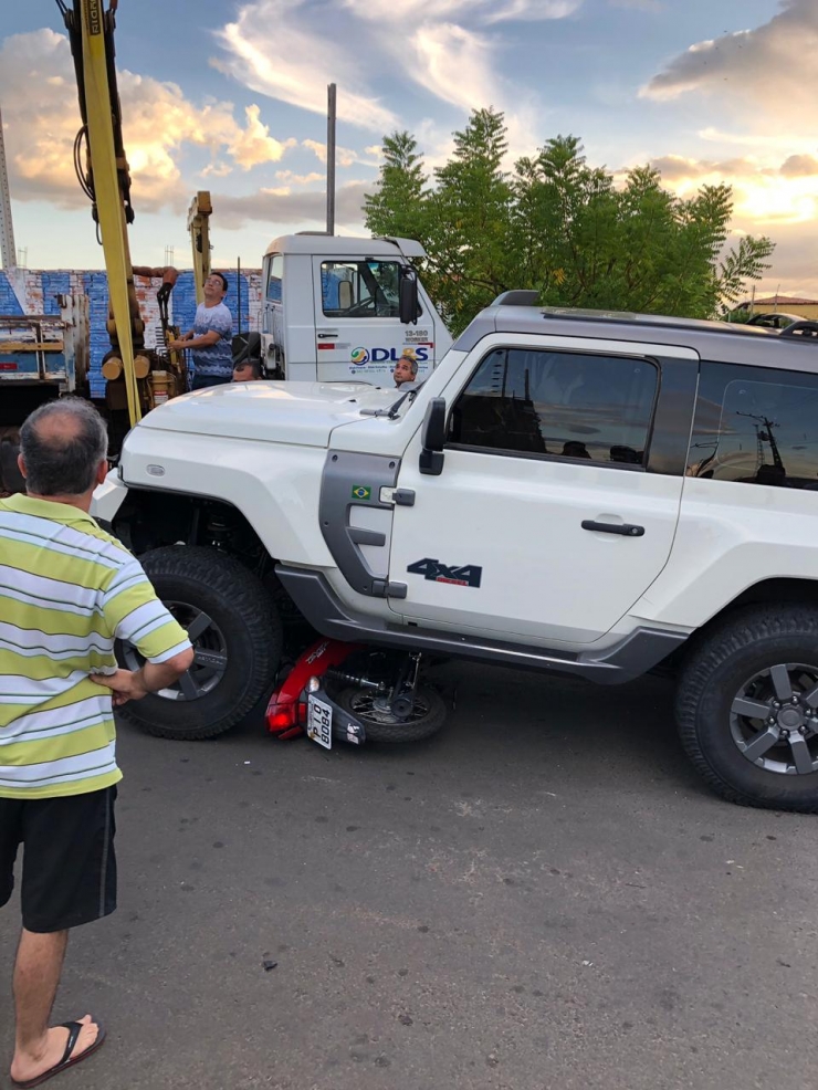 Mulher fica ferida após moto ficar presa embaixo de carro em acidente
