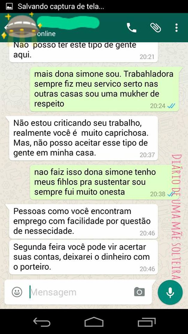 Em três prints, o post mostra uma conversa de whatsapp na qual uma mulher demite uma faxineira por ter descoberto, através do facebook, que a mesma tinha três filhos e não era casada. Sem sequer se esforçar para encobrir seu preconceito, a mulher decreta que não pode permitir “esse tipo de gente” em sua casa. A faxineira foi mandada embora por simplesmente ser mãe solo – e com requintes de crueldade.