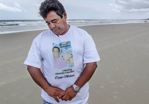 Domingos concordou em falar ontem sobre o tema, mas longe de sua casa ?prefeiru um local perto do mar. A voz era pausada e o olhar, distante. Vestia uma camisa branca com a foto do filho e a frase: "No meu coração onde quer que eu vá".