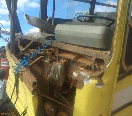 Com o impacto da batida a frente do ônibus ficou danificada, quebrando o para-choque e o para-brisa do veículo.