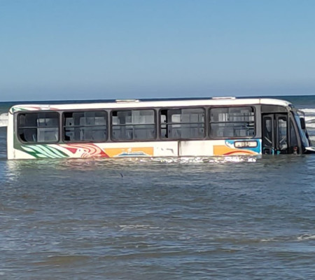 Um ônibus municipal ficou atolado no mar em Ilha Comprida, no litoral de São Paulo, e chamou a atenção de moradores e banhistas, nesta quarta-feira (26). O veículo ficou quase todo coberto pela água. De acordo com a prefeitura, motorista e passageiros não ficaram feridos, e a locomoção é permitida naquela região para o transporte coletivo.