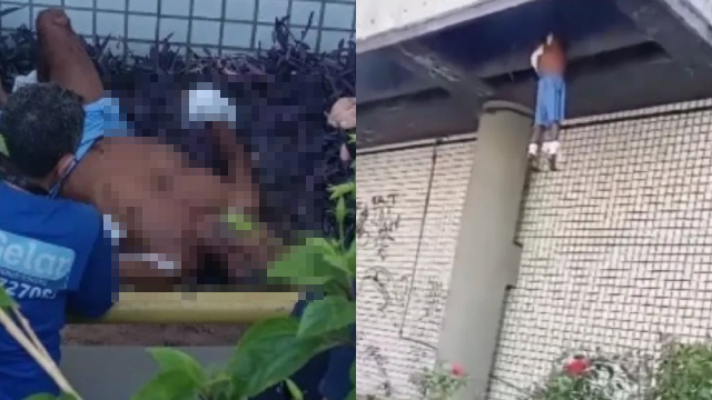 Um paciente que estava internado no Hospital Instituto Doutor José Frota (IJF), em Fortaleza, no Ceará, pulou a janela da enfermaria e caiu do prédio da unidade ao tentar fugir da unidade. Testemunhas flagraram o momento em que o homem fica pendurado na estrutura sem poder se mexer.