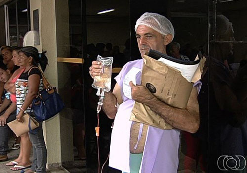 O funcionário público Paulo Francisco, de 56 anos, fez um protesto na porta do hospital Santa Casa de Misericórdia, em Goiânia, na quarta-feira (12). Após ter uma cirurgia pelo Sistema Único de Saúde (SUS) desmarcada pela terceira vez, o paciente saiu direto do centro cirúrgico para a porta da unidade. Ele estava com touca, protetor de pé e segurava um soro já com acesso à veia.