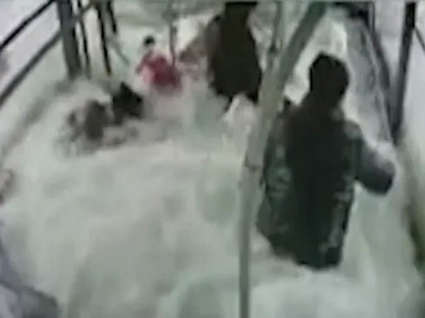 Imagens de câmeras de segurança de dentro do ônibus mostram os momentos de pânico do motorista e dos passageiros quando a água começa a inundar o veículo após a queda.