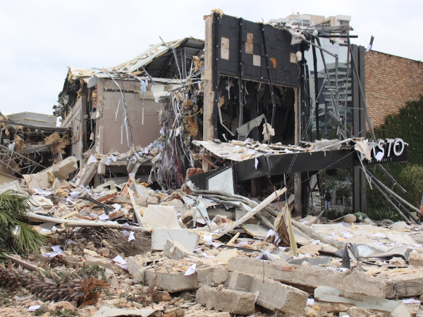 Ainda nos levantamentos, utilizando-se imagens aéreas produzidas por drone constatou-se vários vetores de dissipação de destroços, todos convergindo para o mesmo ponto de origem: a cozinha do Restaurante Vasto. Um dos vetores foi uma parte da Parede da Cozinha, que continha o revestimento cerâmico usado na cozinha. Esse pedaço de parede teve uma projeção de aproximadamente 60,0m em linha reta, cruzando a Rua Joca Vieira e ultrapassando uma barreira edificada (o muro do terreno).