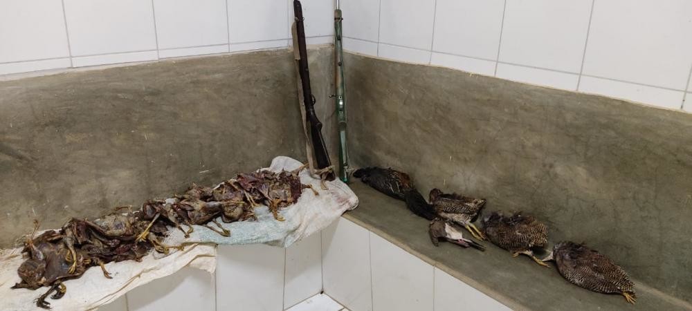 Os agentes do CPA, Capitão. Odair, CB Negreiros e SD Aécio, instauraram uma rápida abordagem e constataram que, de forma distribuída, as motocicletas transportavam 02 cães de caça, 02 espingardas "cartucheiras" de fabricação semi-artesanal, 25 aves silvestres, da espécie "Zabelê", 02 aves silvestres da espécie "jacu", 01 ave silvestre da espécie "juriti", 01 animal silvestre da espécie "tamanduá-mirim", além de alguns apetrechos de caça.