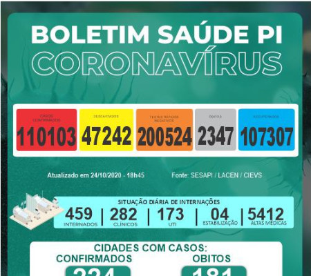 Dos leitos existentes na rede de saúde do Piauí para atendimento à Covid-19, há 459 ocupados, sendo 282 leitos clínicos, 173 UTIs e quatro leitos de estabilização. As altas acumuladas somam 5.412 até o dia 24 de outubro.