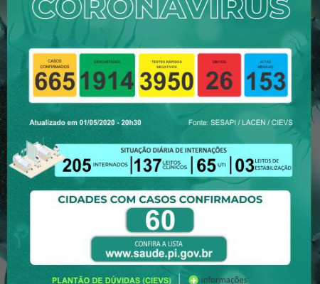 A Secretaria de Saúde do Piauí-Sesapi informou na noite desta sexta-feira (1º/05), através do boletim epidemiológico, o aumento de 65 novos infectados e 2 de mortes por coronavírus nas últimas 24 horas no estado.