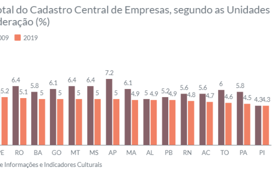 No Brasil, cerca de 6,3% das filiais eram da área cultural em 2019, proporção que era de 7,6% em 2009. O estado com maior concentração é o Rio de Janeiro, onde 8% do total das filiais ativas em 2019 atuavam no setor, índice que foi de 9,4% em 2009. Apenas outros três estados registraram proporções acima da média brasileira em 2019: Distrito Federal (7,7%), São Paulo (7,6%) e Roraima (6,4%). Somente o Ceará teve aumento de participação entre 2009 e 2019, passando de 5,1% a 5,3%.