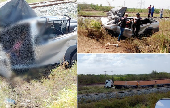 A picape ficou parcialmente destruída sobre o trilho do trem que passa pela região e a carreta foi foi parar mais adiante, após transpor o trilho.