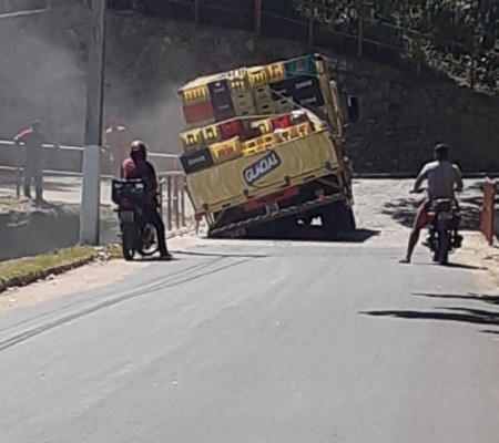 Um caminhão carregado de cervejas ficou com a roda presa ao tentar atravessar a ponte sobre o sangradouro do açude no município de Água Branca, no início da tarde desta sexta-feira (11).
