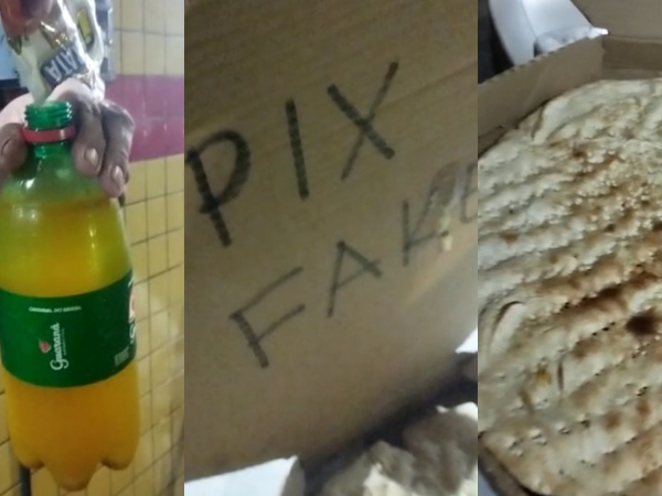 “Checamos novamente na conta e não tinha, mas não assustamos ele e pedimos pata aguardar. E foi onde a gente teve a ideia da pegadinha. Já que ele mandou o pix falso, vamos mandar um pedido falso. A gente pegou uma garrafa vazia de refrigerante, pegamos um suco de pacote, botamos água gelada e colocamos sal no suco. Daí a gente mandou entregar”, disse.