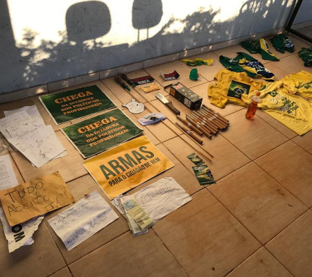 Policiais da Coordenação Especial de Combate à Corrupção e ao Crime Organizado (Cecor), aprenderam fogos de artifício, anotações com planejamento de ações e discursos, cartazes, celulares, um facão, um cofre, e outros materiais destinados a manifestações. A chácara ficava na região de Arniqueira, a cerca de 20 quilômetros da Praça dos Três Poderes.