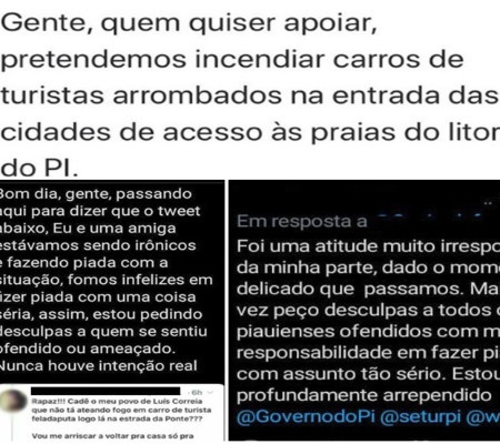 A Polícia Civil de Luís Correia iniciou as investigações sobre as postagens nas redes sociais, mostrando incitação de violência contra turistas no litoral do Piauí. Segundo consta nas publicações, uma pessoa incentiva aos moradores da cidade a atearam fogo nos veículos dos turistas que possam está frequentando as praias, além de xingar. As informações são do portal Costa do Norte.