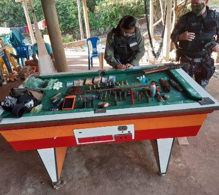 De acordo com informações da PM, após diversas abordagens na cidade, foi informado à guarnição que haveriam dois suspeitos em um bar, localizado à beira da barragem. Ao chegar no referido local, após buscas pessoais foram localizadas várias armas de fogo, munições intactas e deflagradas, uma grande quantia em dinheiro trocado, além de varios outros objetos suspeitos.