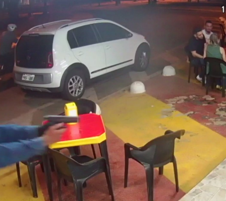 A gravação também mostra o desespero dos clientes no momento em que começa a troca de tiros. Eles imediatamente se abaixam, tentando se proteger dos assaltantes, e acabam derrubando a mesa onde estavam comendo.