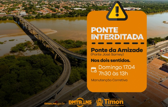 O Departamento Municipal de Iluminação Pública de Timon (DMIP) informou que realizará uma manutenção corretiva na iluminação da Ponte Presidente José Sarney (Ponte da Amizade) no próximo domingo, dia 17 de Abril. Por conta disso, a ponte estará interditada nos dois sentidos a partir das 7h30min até as 13h, para segurança durante a execução do serviço.