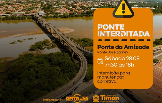 O Departamento Municipal de Iluminação Pública de Timon (DEMIP) vai realizar, no próximo sábado (28), manutenção corretiva da Ponte José Sarney (Ponte da Amizade). Devido à intervenção, a estrutura será interditada, nos dois sentidos, de 7h30 até 18h.