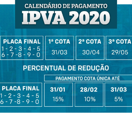 Ainda segundo o novo calendário, o pagamento do IPVA pode ser feito também em 3 cotas, só que sem desconto. O vencimento da 1ª cota acontece no dia 31 de março. As seguintes no dia 30 de abril e 29 de maio, último dia útil do mês.