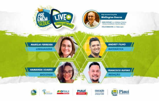 Na sexta (24), a partir das 8h às 13h, os estudantes podem assistir a aula realizada na 20ª GRE – Gerência Regional (Teresina Nordeste) com os conteúdos relacionados às disciplinas de Linguagens, pela professora Marília Ferreira; Física, com Élisson Araújo; Biologia, com Hamanda Soares; Matemática, com Márcio Jean; Química, com o professor Feijão; Ciências Humanas, com Thiago Ramos; e finaliza Redação, com Francisco Rufino. A revisão preparatória terá apresentação do coordenador do Pré-Enem Seduc, Wellington Soares.