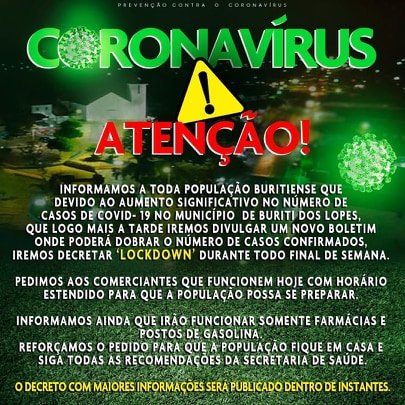 As medidas, segundo a prefeitura, têm como objetivo "resguardar a vida dos buritienses e conter a propagação do Coronavírus".
