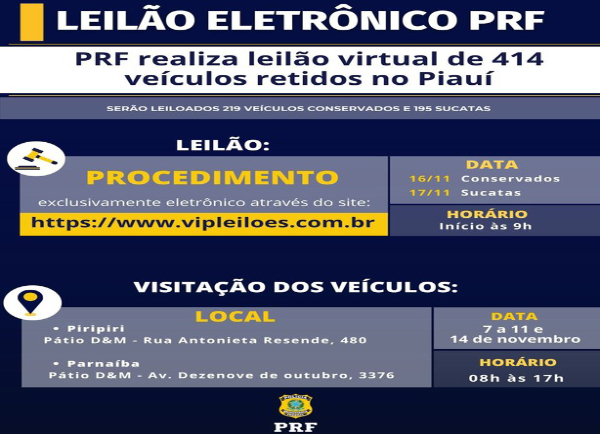 A Polícia Rodoviária Federal (PRF) no Piauí realizará leilão virtual de veículos retidos, abandonados, removidos ou recolhidos e que se encontram há mais de 60 dias nos pátios conveniados nos dias 16  e 17 de novembro de 2022, às 09:00h.