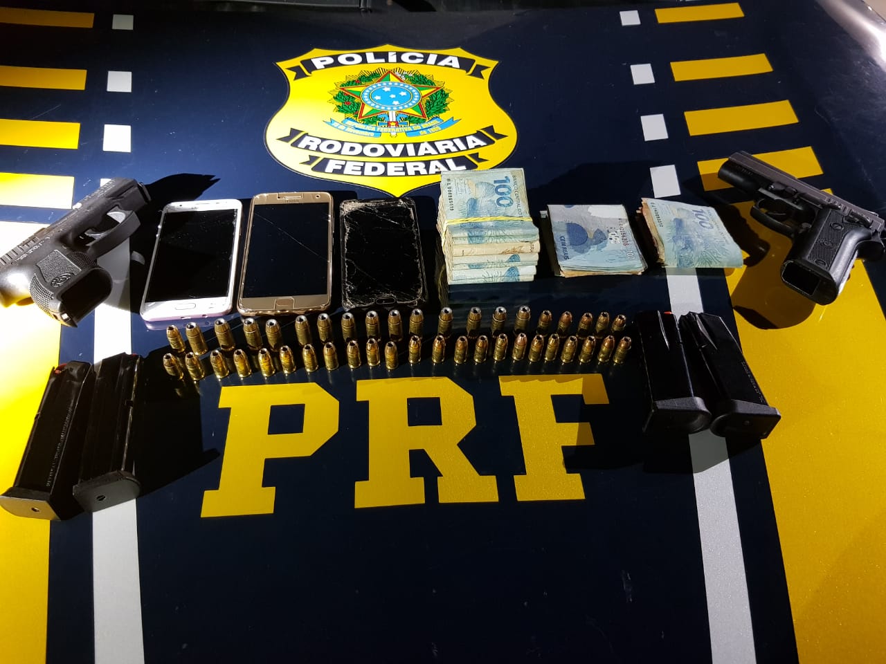 Ao realizar a vistoria nas roupas dos suspeitos foi verificado a quantia de R$ 12.304,00 que não foi informado aos policiais a origem do dinheiro. Um dos suspeitos informou que essa quantia ia ser usada para um procedimento médico. Ao realizar uma busca mais minuciosa no interior do veículo foram encontradas, sob o banco do passageiro, duas armas: uma pistola Taurus PT640 calibre .40 de uso restrito de Propriedade da policia civil do estado de São Paulo com 14 munições e uma pistola Taurus 938, calibre 380 com 29 munições com registro de roubo/furto. As armas estavam municiadas, alimentadas, carregadas e com carregadores reserva. Foram encontrados ainda três celulares de posse dos acusados.
