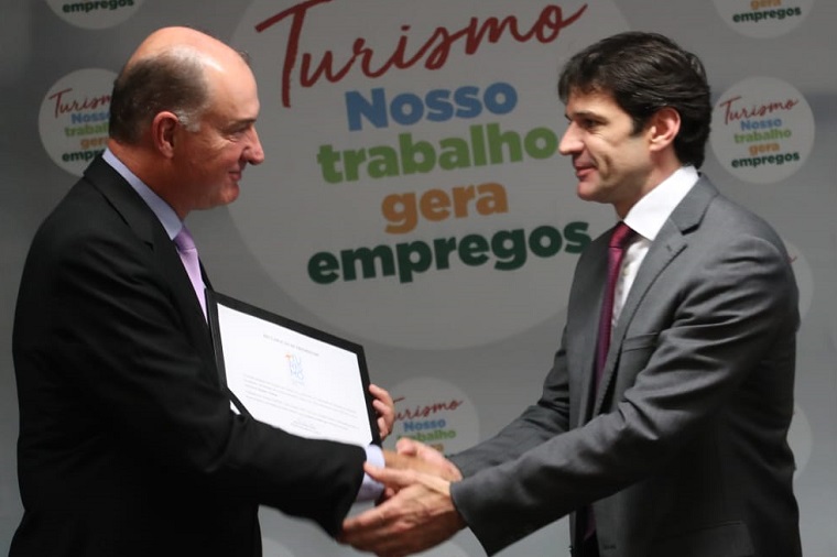 O ministro do Turismo, Marcelo Álvaro Antônio, entregou nesta quinta-feira (17) ao prefeito de Muriaé (MG), Ioannis Konstantinos Grammatikopoulos, o Selo Oficial +Turismo para projeto de infraestrutura turística do município. O documento garante prioridade na análise e tramitação da proposta de financiamento junto ao BNDES. A obra, orçada em R$ 14 milhões, prevê complementos de pavimentação na estrada de acesso do distrito de Itamuri ao distrito de Belisário, na serra de Muriaé. O Prodetur + Turismo, lançado há menos de um ano pelo MTur, já recebeu um total de 126 propostas, que somam mais de R$ 5 bilhões para obras de infraestrutura turística, saneamento, montagem de observatórios de turismo, divulgação de destinos e produtos, entre outras.