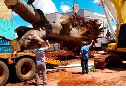 Com o dinheiro, a árvore de 15 metros de altura e 30 toneladas foi podada e içada. Vários homens, carreta, retroescavadeira e um guindaste participaram do trabalho. A planta foi levada para um terreno em uma região afastada da cidade, onde a prefeitura pretende fazer um bosque.
