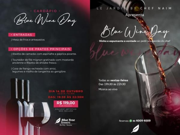 O gerente geral do hotel, Paulo Brito, anunciou que as sextas agora serão especiais no restaurante. “Apresentamos a noite Blue Wine Day, que funciona da seguinte forma: ao pedir o prato da sugestão do Chef, o vinho e o espumante  serão por nossa conta das 19h30 às 22h30”, esclareceu.