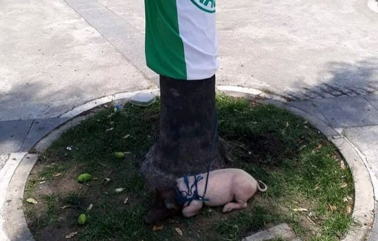 Um filhote de porco foi resgatado na última quinta-feira (25) por ativistas de defesa de animais, após denúncias pelas redes sociais de que alguém havia deixado o animal amarrado a uma árvore, junto com uma bandeira do Palmeiras, próximo ao estádio Maracanã, no Rio de Janeiro.