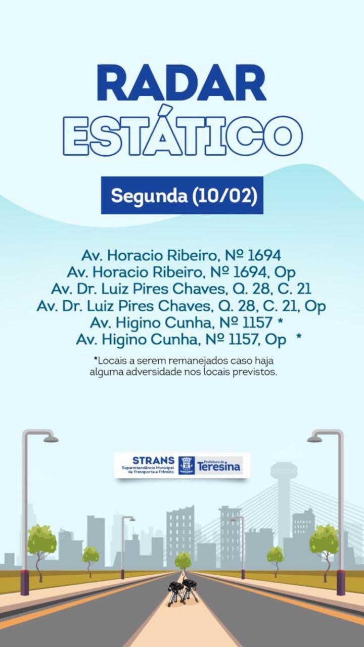 A Prefeitura de Teresina por meio da Strans, divulgou os locais onde serão instalados os radares móveis de redutores de velocidade nesta segunda-feira (10/02), nas suas redes sociais.
