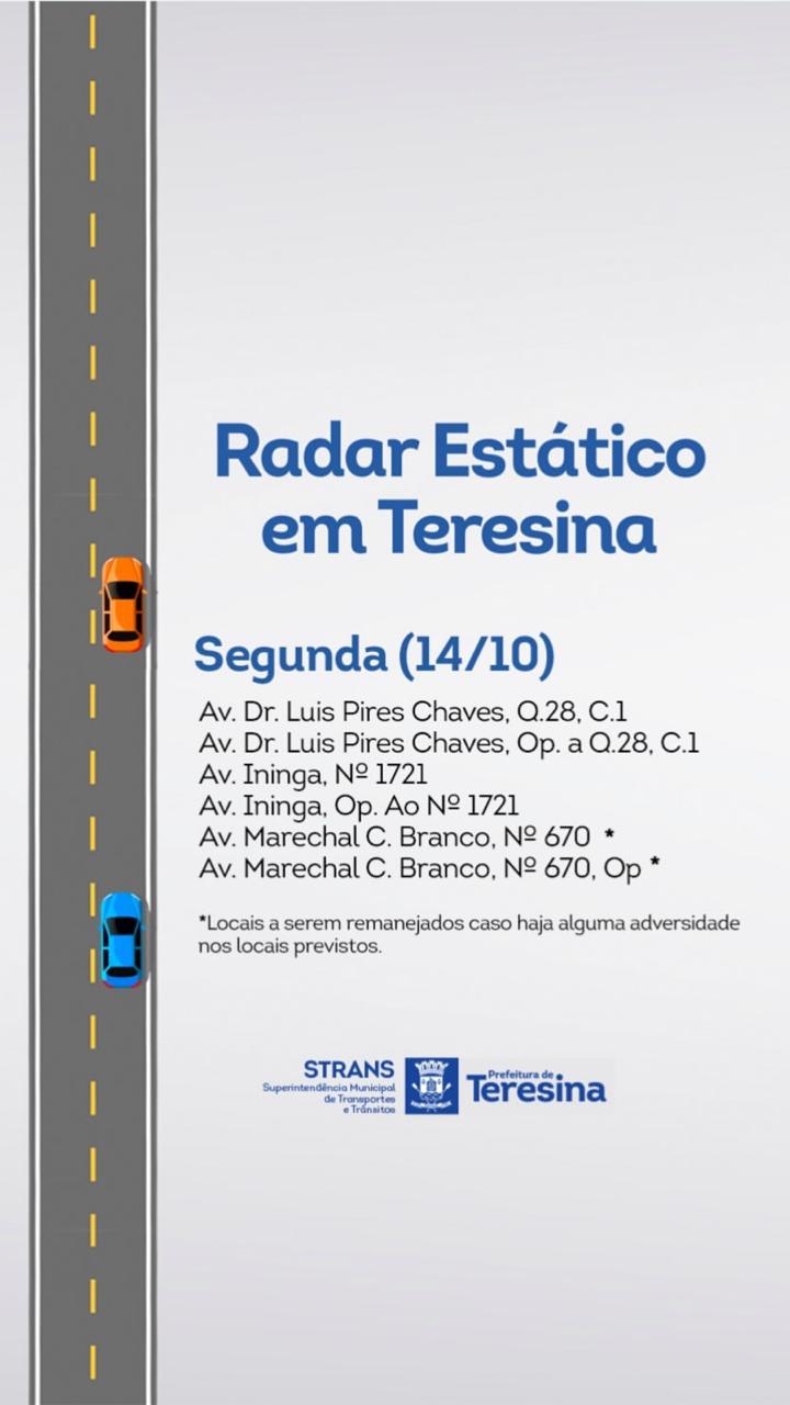 Nesta segunda-feira, o condutor encontrará o aparelho na Avenida Dr. Luis Pires Chaves, no bairro Saci, na zona Sul de Teresina; na Avenida Ininga, na zona Leste de Teresina e na Avenida Marechal Castelo Branco.