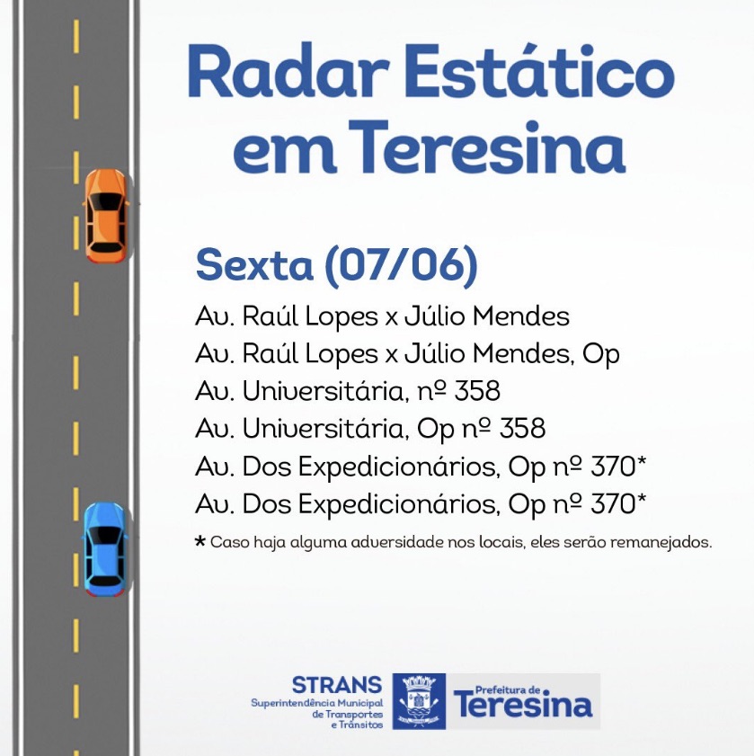 A Prefeitura de Teresina divulgou na manhã desta sexta-feira (07/06), a localização dos radares na capital. Para dar mais transparência aos teresinenses, a lista com a localização dos radares é sempre divulgada no site, já que a presença dos aparelhos é importante para diminuir e prevenir o número de acidentes, assim como dar maior fluidez ao trânsito.