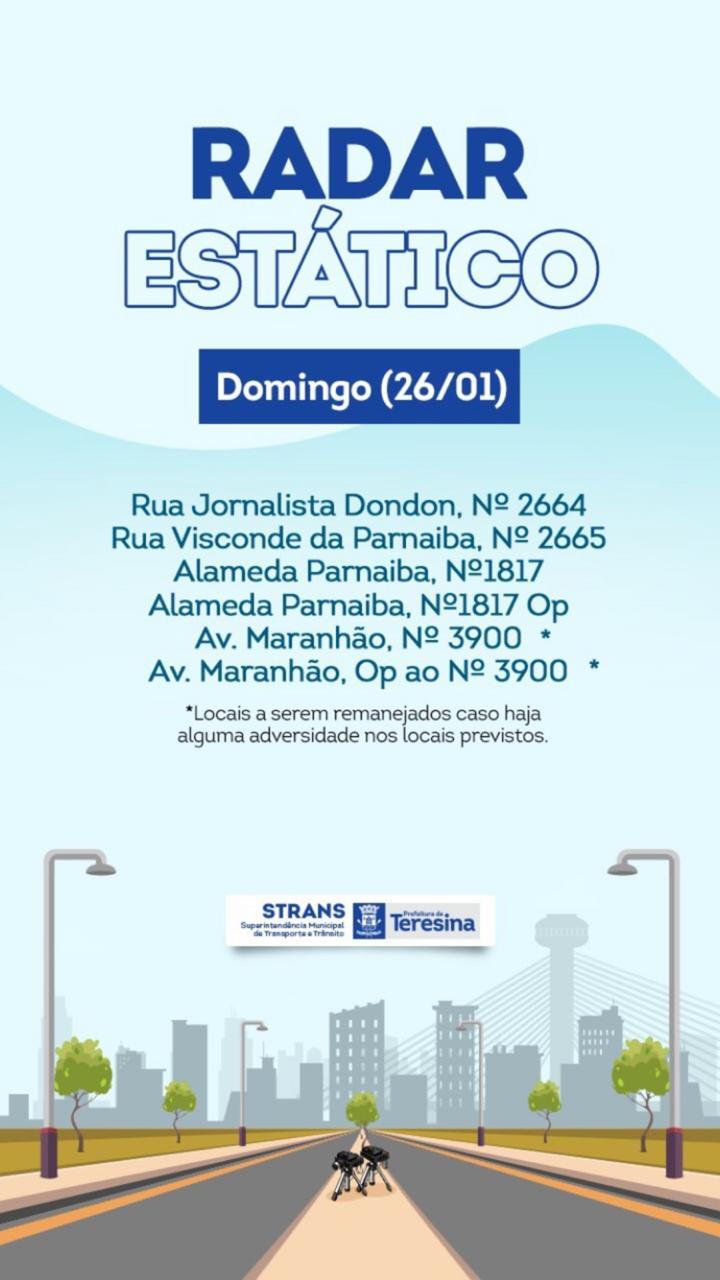 A Prefeitura de Teresina por meio da Strans, divulgou os locais onde serão instalados os radares móveis de redutores de velocidade neste domingo (26/01), nas suas redes sociais.
