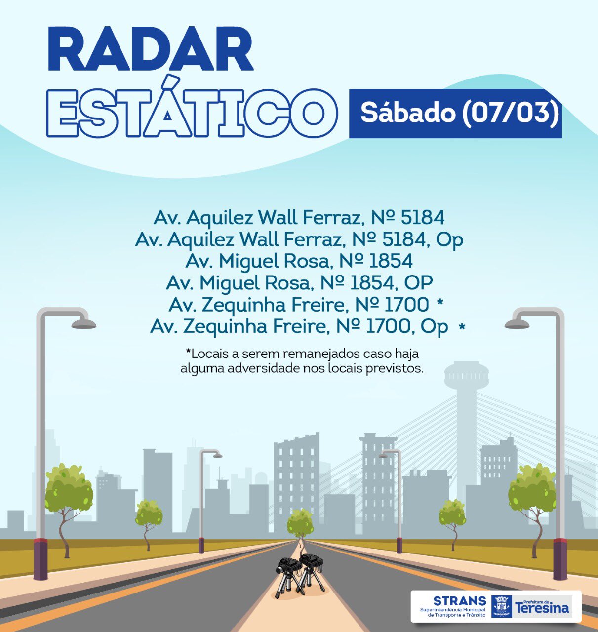 Neste sábado (07/03), a prefeitura divulgou onde estão localizados os radares estáticos: Avenida Aquiles Wall Ferraz, nº 5184; avenida Miguel Rosa, nº 1854; avenida Zequinha Freire, nº 1700.