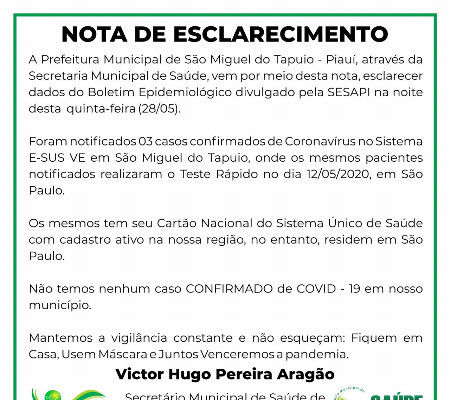 Segundo a nota divulgada pela Secretaria Municipal de Saúde, “foram notificados 03 casos confirmados de Coronavírus no Sistema E-SUS VE em São Miguel do Tapuio, onde os mesmos pacientes notificados realizaram o Teste Rápido no dia 12/05/2020, em São Paulo. Os mesmos tem seu Cartão Nacional do Sistema Único de Saúde com cadastro ativo na nossa região, no entanto, residem em São Paulo”, afirma a nota assinada pelo secretário Victor Hugo, acrescentando que a cidade não tem nenhum caso confirmado de Covid-19.