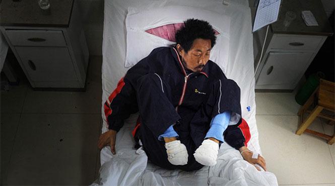 Liu Dunhe, de 44 anos, usou cacos de vidro para conseguir cortar os pés quando as dores tornaram-se insuportáveis. O homem havia sofrido as queimaduras ao andar descalço em sua fazenda, sofrendo com infecções e apodrecimento do tecido de ambos os pés.