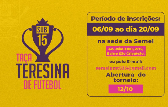 A Secretaria Municipal de Esporte e Lazer (SEMEL) informa que as inscrições para a Taça Teresina de Futebol, categoria sub-15, já estão abertas. Para se inscrever na competição, um integrante de cada time ou o diretor de alguma escolinha deve dirigir-se à sede da SEMEL, localizada na avenida João XXIII, no horário das 7h30 às 13h, e solicitar a sua ficha de inscrição ou, se preferir, enviar um e-mail com as informações necessárias para: semelpmt533@gmail.com. As inscrições para o campeonato se encerram no dia 20 de setembro.